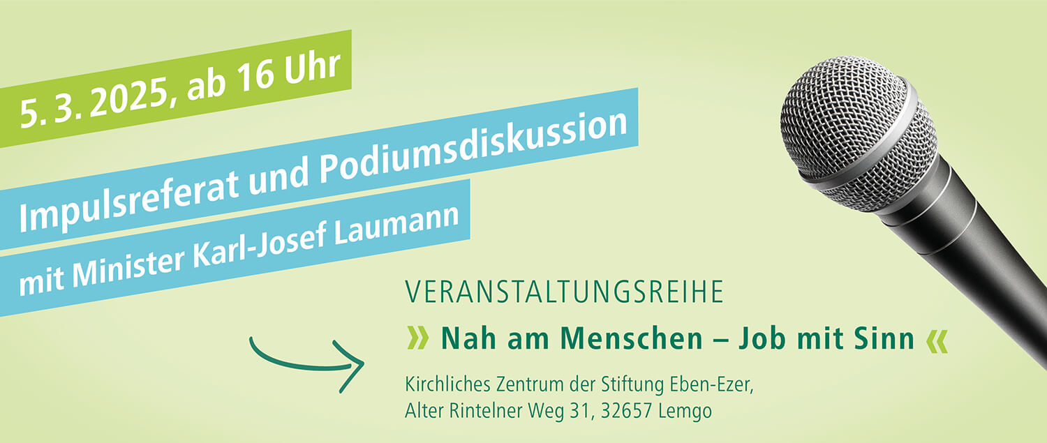 Unsere Auftaktveranstaltung der neuen Veranstaltungsreihe „Nah am Menschen - Job mit Sinn“ findet am Mittwoch, 5. März 2025 ab 16:00 Uhr im Kirchlichen Zentrum der Stiftung Eben-Ezer, Alter Rintelner Weg 31 in 32657 Lemgo statt.