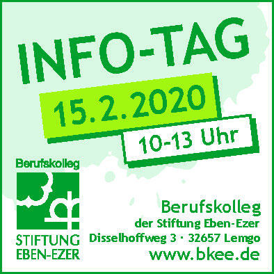 Das Berufskolleg der Stiftung Eben-Ezer veranstaltet am Samstag, dem 15. Februar von 10-13 Uhr einen Infotag und lädt herzlich hierzu ein. An den Informationsständen der verschiedenen Bildungsg ...