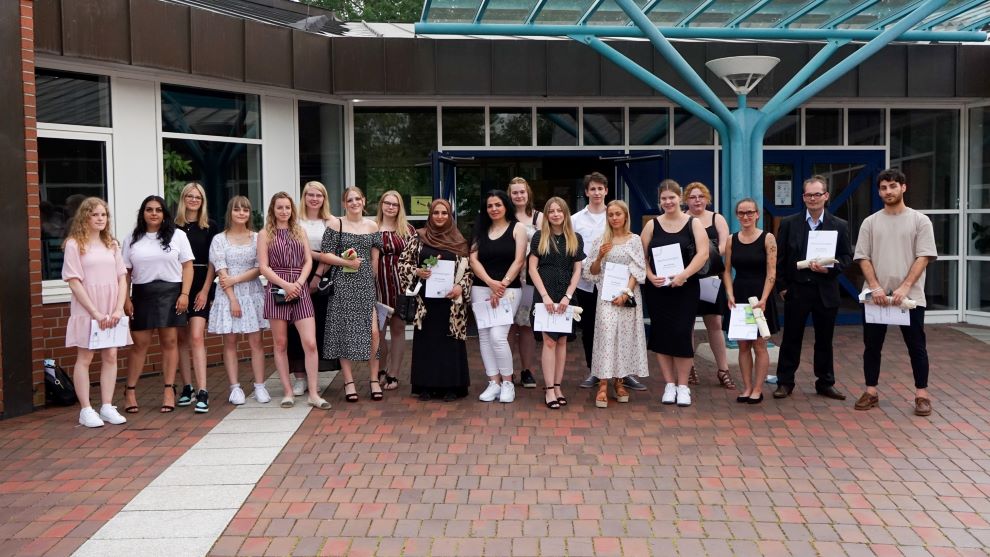Bei ihrer Abschlussfeier konnten die frisch Examinierten auf zwei außergewöhnliche Ausbildungsjahre zurückblicken, denn diese beiden Jahre waren stark durch die Corona-Pandemie gezeichnet. Ein hohes Maß an Flexibilität, Anpassungsbereitschaft und Durchhaltewillen trug dazu bei, dass trotz der Herausforderungen durch die bis dato ungewohnte Nutzung neuer Medien im digitalen Distanzunterricht diese Auszubildenden ihr Ziel erreichten und sich nun „staatlich geprüfte Sozialassistentin/staatlicher geprüfter Sozialassistent“ nennen können. Der Schulleiter Klaus R. Berger verwies in seiner Ansprache auf die Bedeutung der „Kraft der Liebe“, ohne die empathische Arbeit am und mit dem Nächsten nicht möglich ist. In einem nahezu privaten Dialog „nur unter uns“ unterhielten sich die beiden Klassenlehrer, Kai Züchner und Frank Valldorf, über ihre Erfahrungen mit den Auszubildenden und gaben dabei einige lustige Anekdoten zum Besten. Diese Ausführungen wurden in ihrem „Wort für die Examinierten“ durch die Absolventinnen Maja Celin Krüger und Jule Christin Läger konterkariert, die in Form eines selbst verfassten Gedichtes einige Eigenheiten ihrer Lehrer*innen augenzwinkernd kommentierten. Nach der Zeugnisübergabe durch die Klassenlehrer wurde eine Auszeichnung für herausragende schulische Leistungen an die Absolventin Kristina Riedel vergeben.