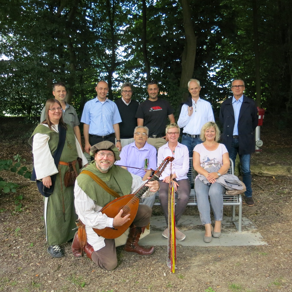 Der Abend begann mit einem gemächlichen Rundgang, begleitet von Henning, dem Barden, der, passend zum Anlass, an mehreren Stellen je ein Bänkellied zum Besten gab. Pastor Dr. Bartolt Haase dankte ausdrücklich allen Firmen für ihre Spende, die gut sichtbar und nachhaltig die Lebensqualität der Bewohner von Neu Eben-Ezer erhöht. So konnte die kleine Gruppe bei ihrem Rundgang schon sehen, dass die neuen Bänke gern zu einer Rast genutzt werden.