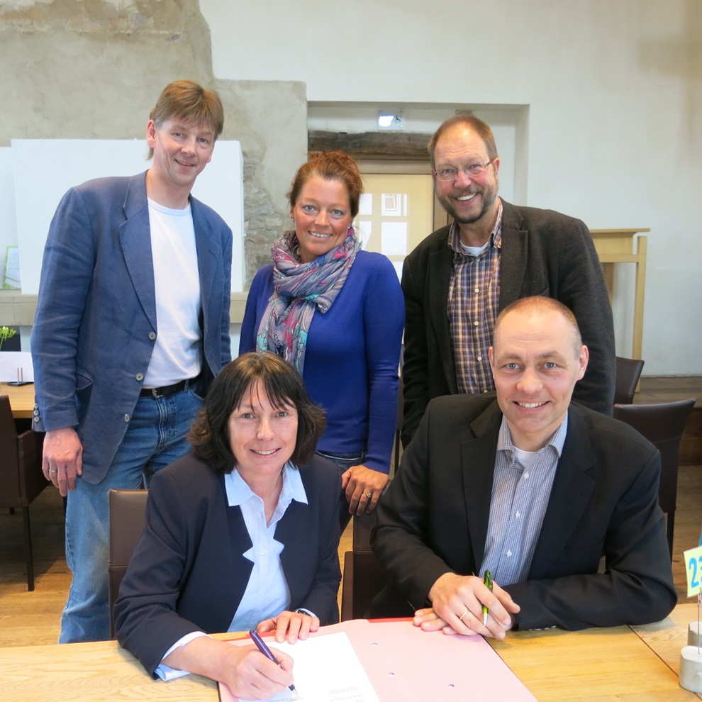 BUZ: Mona Römer, 1.Vorsitzende und Pastor Dr. Bartolt Haase unterzeichnen die Kooperationsvereinbarung. Mit erarbeitet wurde sie von Ralf Küssner, Stiftung Eben-Ezer, Birgit Bleibaum, Koordination Hospizverein und Andreas Lüdeke, ab 1.7.16 Geschäftsführer des Ambulanten Hospiz- und Beratungsdienstes Lippe e.V.