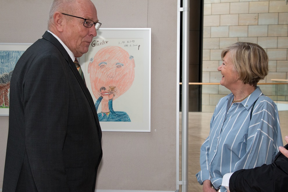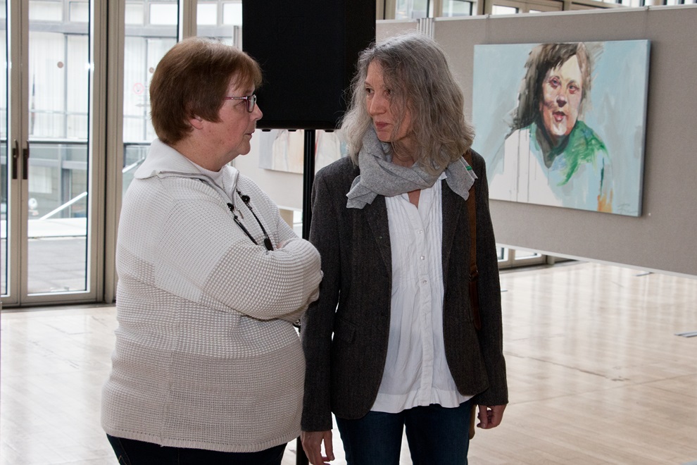 80 Bilder aus der Kunstwerkstatt Eben-Ezer sind noch bis zum 27. März im Düsseldorfer Landtag zu sehen. Am 15. März eröffnete Landtagsvizepräsident Oliver Keymis die Ausstellung. Er begrüßte Sigrid Rutz und Ingolf Braun, die 15 Künstlerinnen und Künstler vertraten, deren Bilder auch in der Halle vor dem Plenarsaal ausgestellt sind. Igor Osters Porträts von Menschen, die mit den Diensten der Stiftung leben, hängen gleich am Beginn der Ausstellung. Igor Oster arbeitet seit 2012 in der Kunstwerkstatt. Der Künstler fängt die Persönlichkeit des Einzelnen ein und zeigt sie in ihrer Eigenart und in ihren Vorlieben, Ingolf Braun zum Beispiel mit Pfeife.