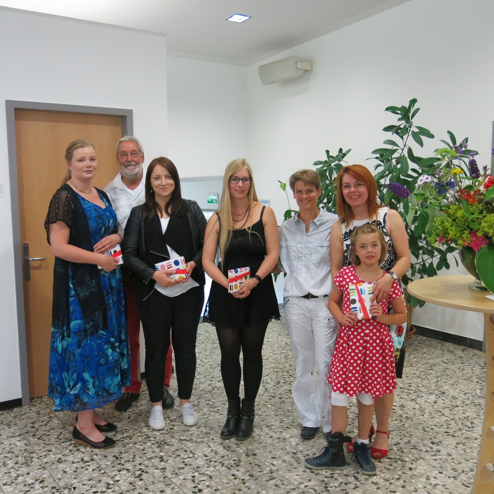 Foto Auszeichnungen für die besten Absolventinnen: Annabelle Vejmelka (Bildmitte) und Juliane Oelmüller (mit ihrer Tochter Elisa) sowie Jennifer Penno und Nesrin Nathalia Jungbluth. Mit ihnen freuen sich die Lehrer Karl-Heinz Elbracht und Dr. Andrea Busche