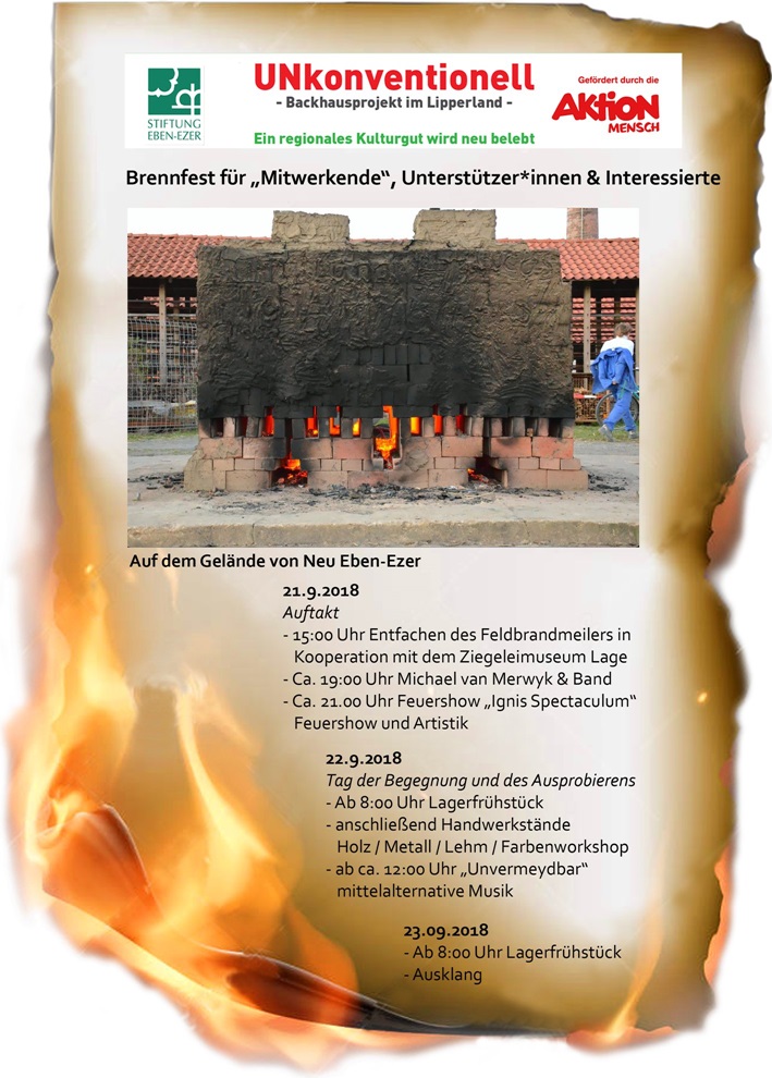 Am 21.9. ab 15:00 Uhr Entzünden des Feldbrandmeilers, 19:00 Auftritt Michael van Mervyck und Band; 21:00 Uhr Feuershow – Neu Eben-Ezer, Alter Rintelner Weg: Wiese vor der Verwaltung