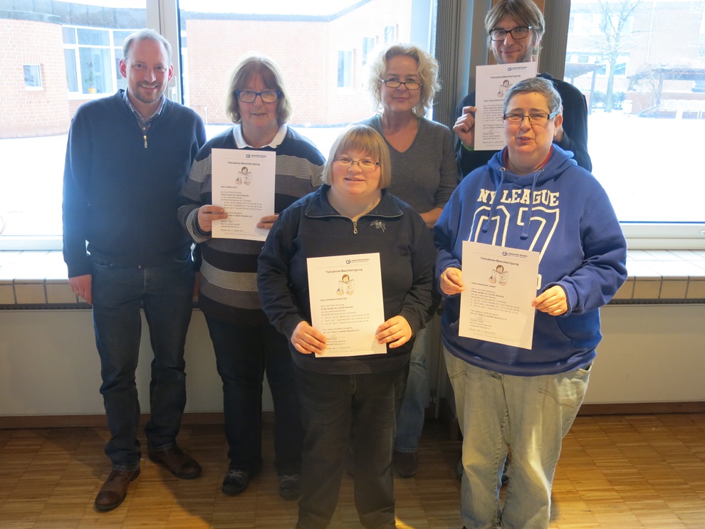 Menschen mit Lernschwierigkeiten können Texte mit vielen Fremdwörtern, langen Schachtelsätzen und kleiner Schrift nicht lesen. Aber auch sehbehinderte und gehörlose Menschen und Menschen, die nicht gut Deutsch können haben Problem mit solchen Texten. Damit diese Menschen nicht ausgegrenzt werden, wurde die Leichte Sprache entwickelt. Leichte Sprache können viele Menschen besser verstehen. Einfache Wörter, kurze Sätze, erklärende Bilder und Prüfung der Texte von den Menschen, für die sie geschrieben wurde – das sind die Regeln für Leichte Sprache. Die Stiftung Eben-Ezer hat seit letztem Jahr ein Büro für Leichte Sprache. Geschulte Übersetzer übertragen schwer zu verstehende Texte in Leichte Sprache. Drei Mitarbeitende stehen dem Büro dabei zur Verfügung. Danach werden die Texte von vier geschulten Prüfern auf Lesbarkeit und Verständlichkeit geprüft. Jeder Prüfer arbeitet anders. Manche lesen schnell, andere langsam. Wenn sie dabei Unterstützung brauchen, helfen ihnen die Übersetzer. Sie erklären einzelne Worte oder lesen den kompletten Text vor. Bisher wurden der Jahresbericht 2016 und die neuen Leitsätze, die die Unternehmensphilosophie der Stiftung abbilden, in die Leichte Sprache übertragen. Als nächstes soll der Heimvertrag übertragen und geprüft werden. Das Prüfen will gelernt sein. Man muss wissen, auf was man achten muss und braucht Mut, seine Kritik klar und deutlich zu äußern. Das und vieles mehr haben die vier aktiven Prüfer aus Eben-Ezer in einer intensiven, sechstägigen Fortbildung gelernt. Christian Glade, Referent für Leichte Sprache bei der Lebenshilfe Bremen, kam dafür dreimal für zwei Tage nach Lippe und brachte seinen Schülern mit viel Engagement und Einfühlungsvermögen das Prüfen bei. Es gibt verschiedene Methoden zu prüfen. Die Eben-Ezer-Gruppe wendet die Texte-auf-Papier-Methode an. Dabei bekommen die Prüfer einen Text und lesen ihn. Worte, die sie nicht verstehen, die schwer zu lesen oder zu lang sind, werden mit einem Textmarker angestrichen. Die Prüfer können auch Worte anstreichen, von denen sie glauben, dass andere – zum Beispiel Kollegen aus der Werkstatt – sie nicht verstehen. Das geschieht dann in einer anderen Farbe. Zum Schluss können sie noch etwas zu den Markierungen schreiben und Vorschläge machen. Danach wird der Text von einem Übersetzer oder Prüfer vorgelesen und es wird darüber diskutiert. Was ist gut, was ist schlecht, wie kann man es besser machen. Die Übersetzer nehmen die Korrekturen mit und überarbeiten den Text so lange, bis alle Prüfer ihn verstehen. Eventuell müssen noch einige informelle Treffen mit einem oder zwei Prüfern vereinbart werden. Im Hintergrund des Büros für Leichte Sprache sorgt ein Multiplikatorenteam dafür, dass in allen Bereichen der Stiftung ein Bewusstsein für die Verwendung von Leichter Sprache geschaffen wird. Dem Multiplikatorenteam gehören Vertreter des Geschäftsbereichs Wohnen und des Bereichs Kinder und Jugendliche an. Außerdem sind der Medizinisch-Psychologisch-Therapeutische Bereich, die Kirchengemeinde, eeWerk und die Stabsstelle für Öffentlichkeitsarbeit vertreten.