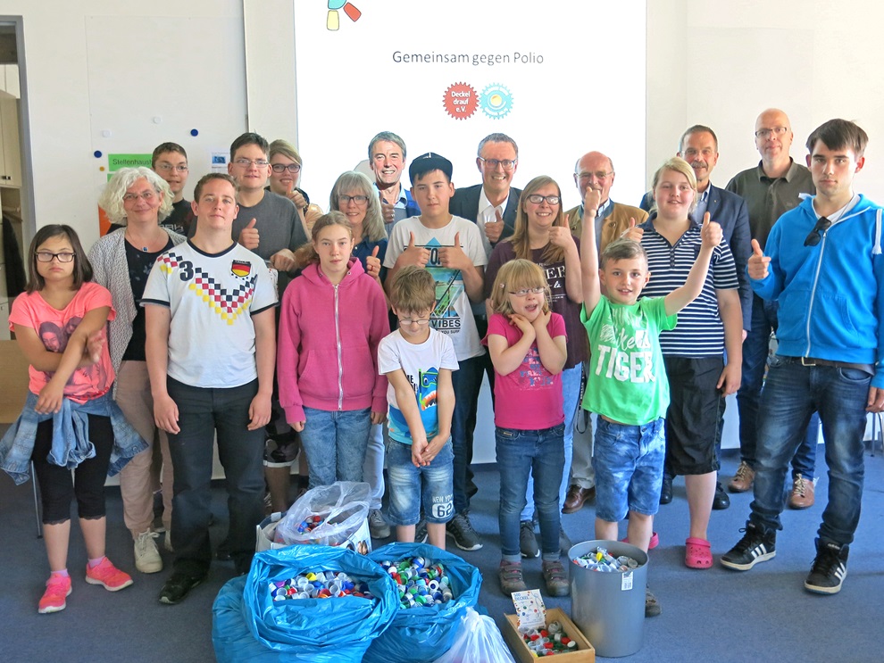 „Ihr habt sehr fleißig gesammelt. Damit kann vielen Menschen geholfen werden“, lobte Matthias Tiemann seine Schüler. Die Kinder aller Jahrgangsstufen der Topehlen-Schule hatten in den letzten Wochen Plastikdeckel von Saft-, Limo- und Wasserflaschen gesammelt, die in den Pausen geleert wurden. „Dabei sind locker 4000 Stück zusammen gekommen“, wusste Lehrerin Gertrud Lehmann zu berichten. Sie hat die Aktion „Deckel drauf“ in der Schule angestoßen. Die Deckel werden recycelt und mit den Erlösen aus dem Verkauf wird die Aktion „Kinderlähmung ausrotten“ unterstützt. Schon im Jahr 1985 riefen die Rotarier diese Unterstützungsmaßnahme ins Leben, wie Dr. Thomas Richter berichtete. Der Arzt ist Mitglied im Rotary Club Lemgo-Sternberg. Zusammen mit seinen Clubkollegen Henning Brachvogel, Jens Conrad und Markus Karthaus war er in die Topehlen-Schule gekommen, um die Säcke mit den Plastikdeckeln in Empfang zu nehmen und den Kindern und Lehrern für ihr Engagement zu danken. Dr. Richter erklärte den aufmerksamen Zuhörern die Krankheit und wies darauf hin, wie einfach sie zu bekämpfen sei. Mit einer Impfung – Schlucken oder Pieksen – ist die Kinderlähmung für immer gebannt. 500 Deckel ergeben rund ein Kilo Plastikmüll. Dafür bekommt man eine Impfung. Mit den Deckeln, die die Schüler bis jetzt gesammelt haben, können also acht Menschen geimpft werden. Diese Menschen sind dann ein Leben lang geschützt. Ein toller Erfolg. Und alle waren sich einig: „Wir machen weiter!“