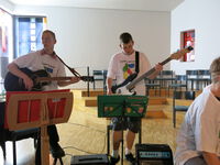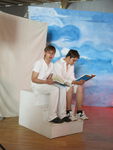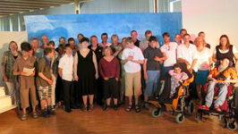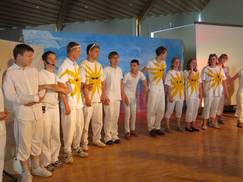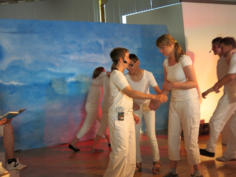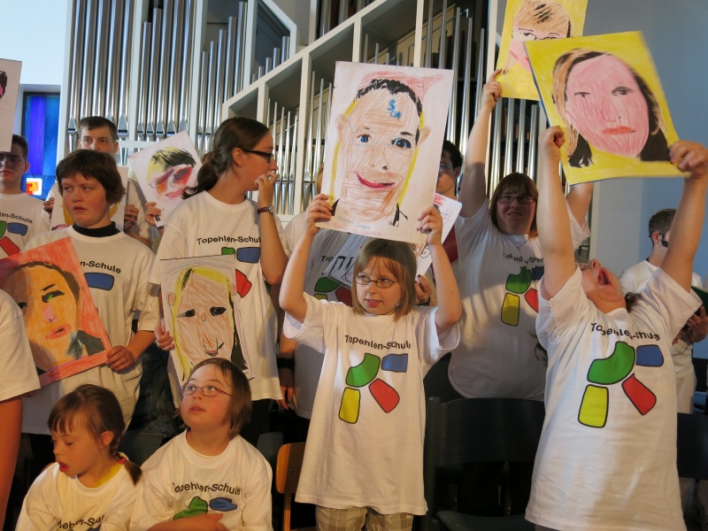 Was kommt jetzt? Was ist mir wichtig für mein Leben. Die große Frage "Warum bin ich auf der Welt" beschäftigte 15 Jugendliche der Stiftung in einer Szenencollage, die sie mit der Theaterpädagogin Christl Brüning erarbeitet hatten. Mit phantasievollen Requisiten, witzigen Beamerspots und professionell wirkender Lichttechnik ging eine hinreißende, mal lustige, mal nachdenkliche Szenenfolge der Sinnfrage nach (Bildergalerie siehe unten). Der Schulchor mit allen Altersgruppen und begleitet von Percussioninstrumenten und Gitarren sorgte für einen flotten musikalischen Rahmen. Der Leiterin Christiane Humpert wurde ebenso wie dem technischen Leiter der Aufführung Dietmar Grascha, hauptberuflich Hausmeister in der Topehlen-Schule und im Berufskolleg, mit einem Blumenstrauß von Vorstand Pastor Dr. Haase gedankt. Bevor sich Haase in das fröhliche Gruppenfoto einreihte, sagte er: "Hier kann man erleben wie Gemeinschaft wunderbar gestaltet wird."