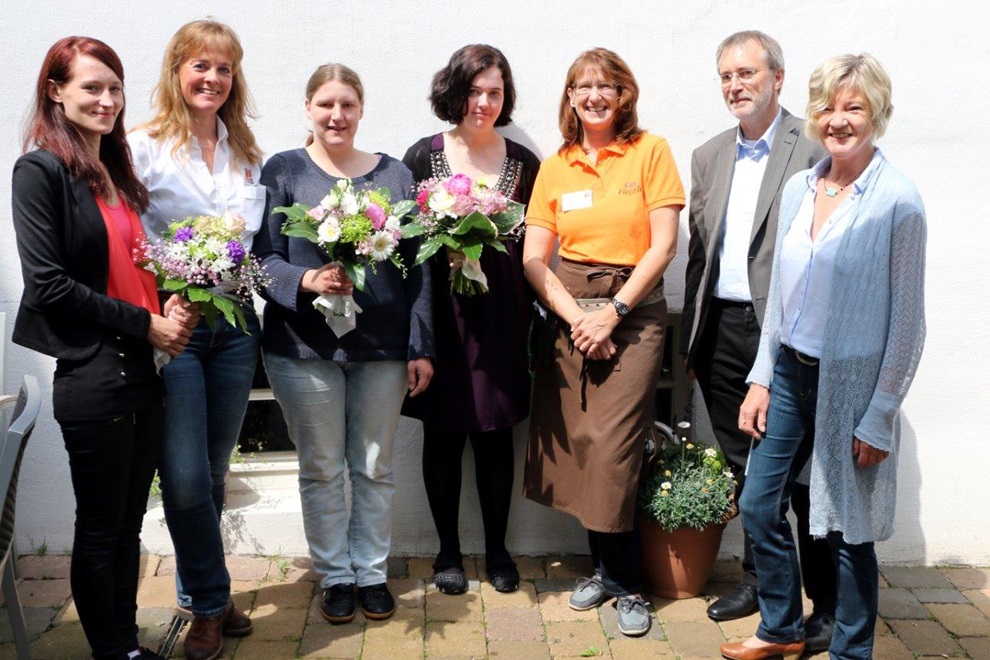 Drei junge Frauen haben vor kurzem erfolgreich ihre Ausbildung im Integrationsbetrieb Café Vielfalt beendet. „Das sind unsere ersten Auszubildenden, die ihren Abschluss hier gemacht haben“, bemerkt die Leiterin des Cafés Ina Meise-Laukamp stolz. Auch der Kaufmännische Vorstand Udo Zippel freut sich sehr darüber und kam zum Gratulieren mit drei Blumensträußen vorbei. Im Café arbeiten Menschen mit und ohne Behinderungen im Team zusammen. Dieses Konzept hat sich bewährt und kommt bei den Gästen seit über fünf Jahren sehr gut an.