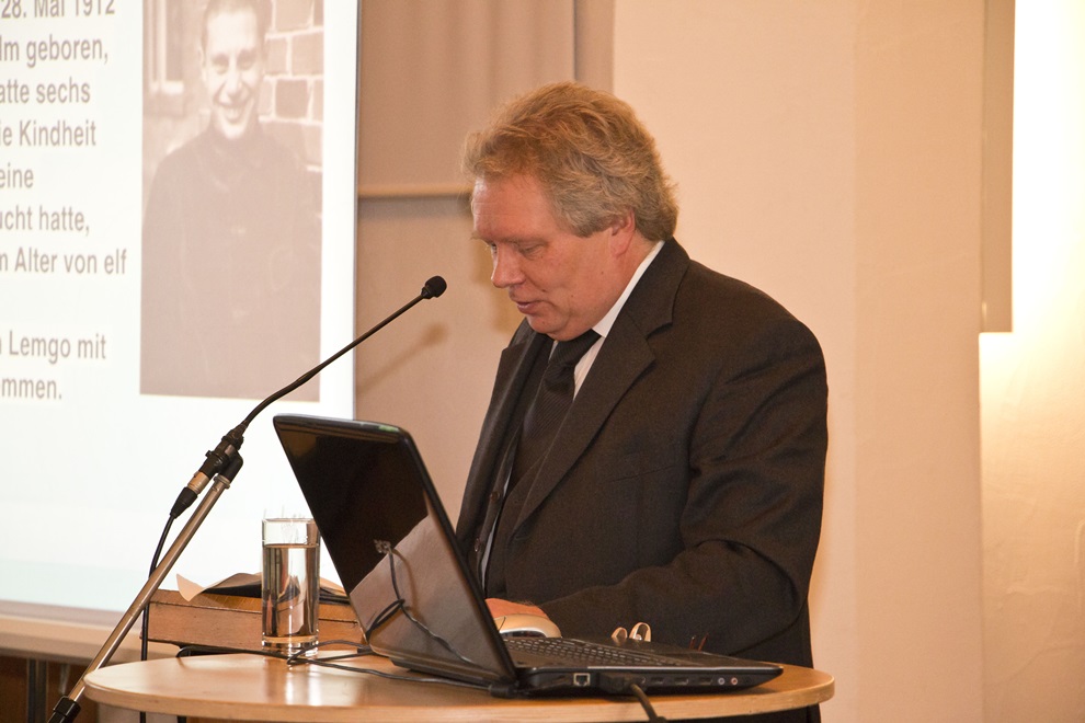 Die Fachtagung und die Vorstellung der neuen Gedenkstele beim Gottesdienst am 19.11. treffen auf große Resonanz mit mehr als 130 Personen. Bei der Tagung in Alt Eben-Ezer stellt Heinrich Bax als erster Referent die Stationen seiner Recherche „Eben-Ezer-Warstein-Weilmünster-Hadamar“ vor. Der ehemalige Lehrer an der Förderschule „Lernen“ in Oerlinghausen hat die Spuren der abtransportierten Bewohner Eben-Ezers verfolgt und aufgedeckt. Dr. Frank Konersmann stellt die Methodik seiner Biographien-Arbeit dazu vor und verliest zwei Biographien. Professor Dr. Hans-Walter Schmuhls Vortrag widmet sich den Beziehungen und Vernetzungen der drei ostwestfälisch-lippischen Einrichtungen Eben-Ezer, Bethel und Wittekindshof vor dem Hintergrund der NS-„Euthanasie“. Außerdem spricht Margret Hamm für die Arbeitsgemeinschaft Bund der „Euthanasie“-Geschädigten und Zwangssterilisierten.