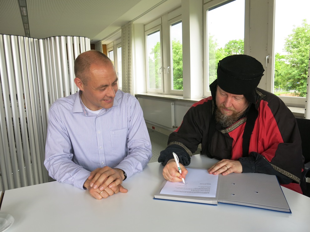 Die Mittelaltergruppe „Heiden Spektakel e.V.“ und Eben-Ezer pflegen schon seit mehreren Jahren eine lebendige Partnerschaft. Bereits zweimal fand auf dem Gelände von Alt Eben-Ezer ein großer, zweitägiger Mittelaltermarkt statt, den viele Lipper besuchten. Dabei sind den Maiden und Recken aus Heiden die Bewohnerinnen und Bewohner der Stiftung ans Herz gewachsen. Andererseits sind die vielfältigen Angebote und Aktivitäten, mit denen sich der Mittelalterclan in den Alltag der Bewohner einbringt, eine große Bereicherung. Vor kurzem wollte man der Verbindung einen offiziellen Rahmen geben und setzte einen Kooperationsvertrag auf. Mehrere mittelalterlich gewandete Frauen und Männer kamen mit Marktvogt Kai Rosin in die Verwaltung der Stiftung, um das Dokument zu unterzeichnen. Gemeinsam sollen mittelalterliche Märkte, Tanzveranstaltungen und Zeltlager für Bewohnerinnen und Bewohner auf dem Stiftungsgelände durchgeführt werden. Das erste gemeinsame Projekt dreht sich um den traditionellen Weihnachtsmarkt der Stiftung Eben-Ezer. Er findet immer am Samstag vor dem ersten Advent statt, in diesem Jahr ist das der 2. Dezember. Die Frauen, Kinder und Männer von Heiden Spektakel werden ihr Zeltlager hinter der Kirche aufbauen und den Weihnachtsmarkt mit ihren Angeboten bereichern. Händler bieten mittelalterliche Waren feil und zeigen altes Handwerk. Münzsägen, Rosshaarflechten, Gewandschneiderei, Töpferei und Trommelbau wird demonstriert und man kann auch mitmachen. In Garküchen gibt es Mittelalterkost und Getränke. Der Mittelaltermarkt wird ein zweitägiger Markt sein. Das heißt, er findet auch am darauf folgenden Sonntag statt. Der Weihnachtsmarkt bleibt aber eine eintägige Veranstaltung. „Mal sehen. Vielleicht schlafen wir auch in unseren Zelten. Das kommt ganz darauf an, wie kalt es wird“, sagt Kai Rosin. Zur Sicherheit stehen aber auch Übernachtungsmöglichkeiten in den Räumen der Stiftung zur Verfügung. Marktvogt Rosin unterzeichnete mit Vorstandssprecher Dr. Bartolt Haase den Vertrag. Ein weiteres, langfristiges Ziel der Kooperationspartner ist der Bau eines historischen Vereinsheimes für Heiden Spektakel. Hier kann Eben-Ezer mit Erfahrung punkten, denn im Rahmen von dem Projekt UNkonventionell werden zur Zeit unter der Regie der Stiftung vier historische Backhäuser in Lippe errichtet. Für die Umsetzung und Ausgestaltung der vereinbarten Kooperation wird ein Kooperationsrat einberufen.