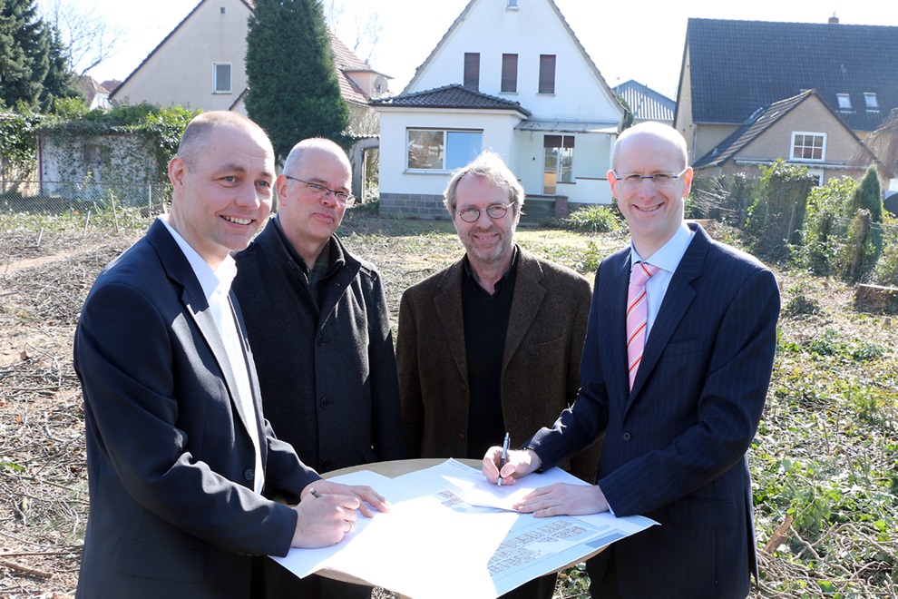 Die LNK Dr. Spernau, Bad Salzuflen, und die Stiftung Eben-Ezer, Lemgo, wollen ihre Dienste für Menschen mit seelischen Beeinträchtigungen bündeln und ergänzen. Die Zusammenarbeit soll in Form einer Kooperationsvereinbarung konkretisiert und verbindlich getroffen werden. Dieses Vorhaben bekräftigten Pastor Dr. Bartolt Haase, Vorstand der Stiftung Eben-Ezer, und Alexander Spernau, Geschäftsführender Gesellschafter der LNK Dr. Spernau GmbH & Co. Kg., durch ihre Unterschrift unter einen „letter of intent“. Beide Partner betonten ihr gegenseitiges Interesse an der Zusammenarbeit, die eine Komplettierungen der jeweils eigenen Leistungen durch den Kooperationspartner darstellt. „Eben-Ezer ist daran interessiert, das ärztlich-psychiatrische Knowhow der Institutsambulanz der LNK sowie Möglichkeiten zur klinischen Unterbringung zu nutzen“, sagte Pastor Dr. Haase. „Für die LNK stellt die Versorgung für psychiatrisch und seelisch erkrankte Menschen nach einem Klinikaufenthalt durch geeignete Wohnformen, wie sie Eben-Ezer mit der neuen Wohnanlage an der Heldmannstraße erbringen wird, eine bislang fehlende Ergänzung dar“, erklärte Alexander Spernau. Wie berichtet wird die Stiftung Eben-Ezer auf den Grundstücken Heldmannstraße Nr. 35 a und Nr. 37 Wohnangebote für insgesamt 24 Menschen bauen. Durch die Kooperationsvereinbarung soll eine niedrigschwellige, im Bedarfsfalle auch sehr kurzfristige fachärztliche psychiatrische Versorgung vor Ort sichergestellt werden. Weitere Kooperationsfelder sind beispielsweise Hospitationen von Mitarbeitenden in den jeweiligen Institutionen sowie Fortbildungen. „Durch die Kooperation und Bündelung unserer Kompetenzen wird das Angebot für seelisch erkrankte Menschen in der Region vielfältiger und besser“, sagten Alexander Spernau und Pastor Bartolt Haase gestern in Bad Salzuflen in der Heldmannstraße nach der Unterzeichnung. Gemeinsam mit Michael Sterna, Leiter des Wohnverbunds für psychosoziale Hilfen, und Wilhelm Brinkmann, Leiter des Geschäftsbereichs Wohnen der Stiftung, unterstrichen sie die perfekte Lage für das Wohnprojekt in Schötmar, das beste Voraussetzungen für gelebte Inklusion biete. Die Planungen für das Wohnangebot liegen vor, für die Fertigstellung rechnet die Stiftung ab dem Zeitpunkt der Baugenehmigung mit eineinhalb Jahren. Die Kosten für die Wohnanlage sind auf ca. 2,4 Millionen Euro projektiert. Die Wohnanlage wird aus zwei Teilen bestehen, einem zweigeschossigen Gebäude zur Heldmannstraße hin und einem eingeschossigen Gebäude dahinter. Ein Café zwischen den beiden Häusern ist ebenfalls geplant. Weitere Flächen sind für Parkplätze vorgesehen. In den vergangenen Wochen hat der Integrationsbetrieb der Stiftung Liemer Lilie das Gelände hinter den Häusern, das fast waldartig bewachsen war, bereits gelichtet und etliche Bäume gefällt.