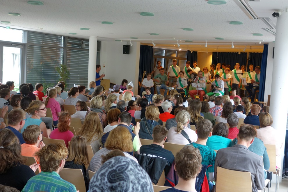 Die Projektwoche endete am letzten Freitag mit einer Präsentation in den Klassenräumen und einem Abschluss in der Aula. Hier informierten sich Eltern, Erzieher und weitere Interessierte und bedachten insbesondere die kleine Bühnenshow der Klassen mit viel Applaus.