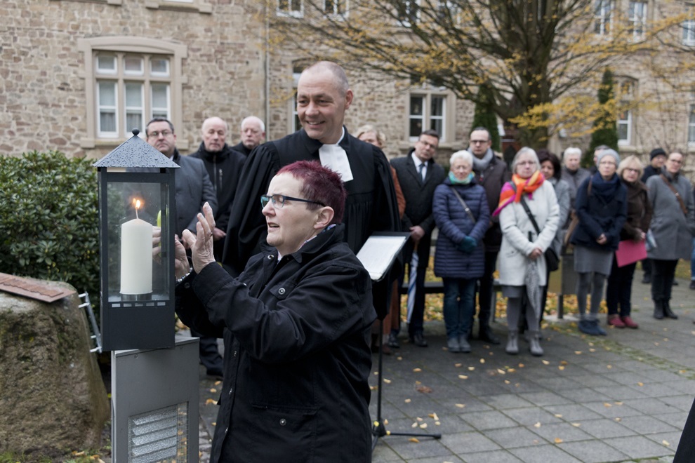 Pastor Dr. Bartolt Haase nannte die Gedenkstele ein Zeichen dafür, „dass wir uns als Stiftung Eben-Ezer der Verantwortung gegenüber den zu Opfern gewordenen Menschen stellen, ein Zeichen dafür, dass wir aus einem aktiven und aufrichtigen Gedenken für heutiges und zukünftiges Handeln lernen wollen.“ Er dankte Helmut Monzlinger, Heinrich Bax und Frank Konersmann für ihre Impulse und wissenschaftliche Aufarbeitung. Haase dankte auch im Namen seines Vorstandskollegen Udo Zippel den kirchlichen und gesellschaftlichen Institutionen aus der Region für ihre ideelle und finanzielle Unterstützung. Das sind die Alte Hansestadt Lemgo, der Kreis Lippe, der Landesverband Lippe, die Lippische Landeskirche, der Landschaftsverband Westfalen-Lippe sowie der Förderverein der Diakonie Lippe. Christine Schulze wohnt seit mehr als 40 Jahren in einer Wohnanlage der Stiftung in Lüerdissen. Sie entzündete eine Kerze in einem Windlicht. Eine warme Flamme, die „gegen die Kälte des Stahls und der darin symbolisierten Herzenskälte“ brennt, wie es Robert Pasitka bei seiner Erläuterung des Materials der Stele ausdrückte. Stellvertretend für alle Unterstützerinnen und Unterstützer des Projekts sprach Landrat Dr. Axel Lehmann. Er zeiget sich in seinem Grußwort besorgt über aktuelle politische Parteien und Haltungen rechts von der CDU. Nach einem Gebet und stillem Gedenken fand ein bewegender Gottesdienst statt, musikalisch gestaltet durch den Hausmusikkreis Linde und Kantorin Anna Ikramova. Im Gottesdienst verlas Christine Schulze im Wechsel mit Pastor Dr. Bartolt Haase die 36 Namen.