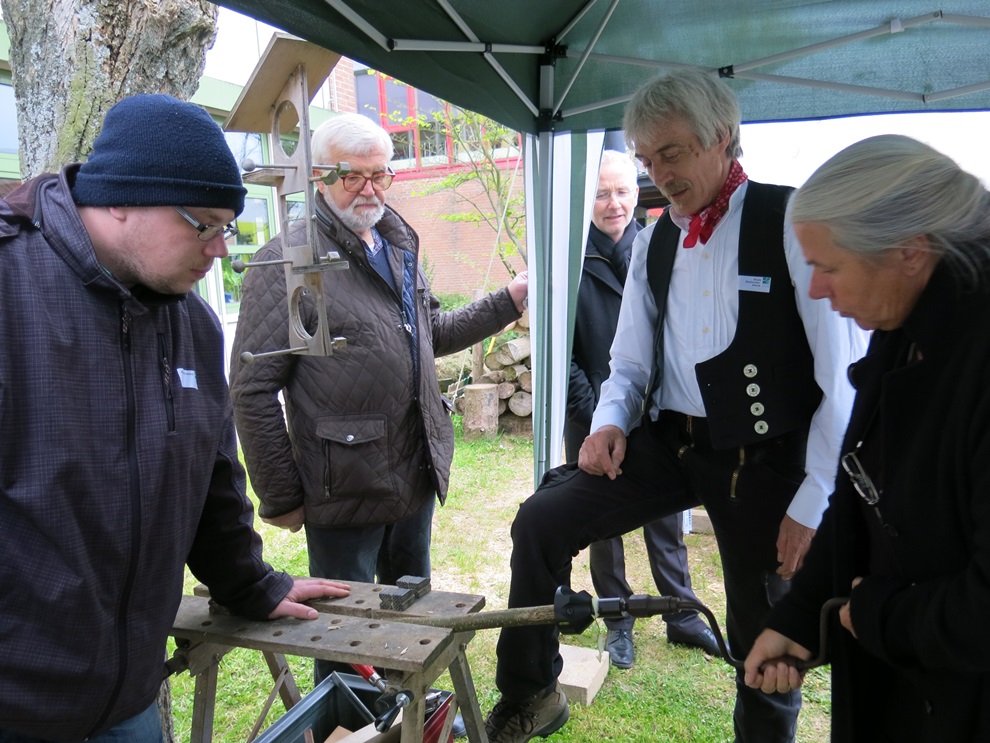 Bruno Rischmüller-Affeldt und sein Kollege Uwe Keen erwiesen sich auch kulinarisch als kreativ. Nach dem informativen Teil luden sie die Gäste zu selbstgebackenem Flammkuchen vor das Werkstattgebäude ein. Dort war der Ofen schon eingeheizt. Zwischen Flammkuchen und Butterkuchen gab es Gelegenheit, die eine oder andere handwerkliche Tätigkeit auszuprobieren.
