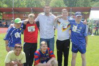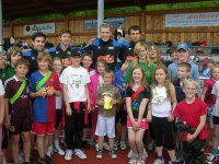 Die Grundschule Lieme war mit großem Aufgebot an jungen Sportlerinnen und Sportlern vertreten. Spielparcours und Wettkämpfe sorgten bereits kurz nach dem Start um 10 Uhr für eine super Stimmung. Und als noch vier Spieler des TBV dazu kamen, um beim Staffellauf mitzumachen, kochte die Stimmung richtig auf. Mark Schmetz, Lars Kaufmann, Martin Strobel und Tamas Mocsai liefen die Staffel unter erschwerten Bedingungen. Die erste Runde ging es rückwärts, die zweite Staffel seitwärts und Mark Schmetz schwebte gewissermaßen über die Aschenbahn. "Das ist so toll, dass die hier sind. Danke!", Andreas Meierjohann war begeistert und umarmte seine Nachbarin statt der TBV-Originale, an die er gerade nicht herankam, weil sie von einer Traube Knirpse umringt waren, die sich von ihren Helden Autogramme auf die Hände schreiben ließen. Sie schworen hinterher, die so geschmückten Hände bis auf weiteres frei von Wasser und Seife zu halten.