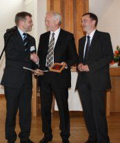 Nur wenigen wird diese Auszeichnung zu Teil, aber das HAUS DER VIELFALT erhielt sie schon am Tag der Indienststellung mit geladenen Gästen: das Siegel der Alten Hansestadt Lemgo, persönlich überreicht durch den Bürgermeister Dr. Reiner Austermann. "Wir gehen sehr sparsam mit der Verleihung des Siegels um, aber dieses Haus hat es einfach verdient, weil hier ein Traum verwirklicht wurde", lobte Dr. Austermann das Modellprojekt unter dessen Dach sich das Café Vielfalt, die Kunstwerkstatt der Stiftung und drei Wohnungen für behinderte Menschen befinden. Überreicht wurde die Auszeichnung am 16. April im Rahmen des Jahresempfangs der Stiftung an die Vorstände Pastor Hermann Adam und Udo Zippel.
