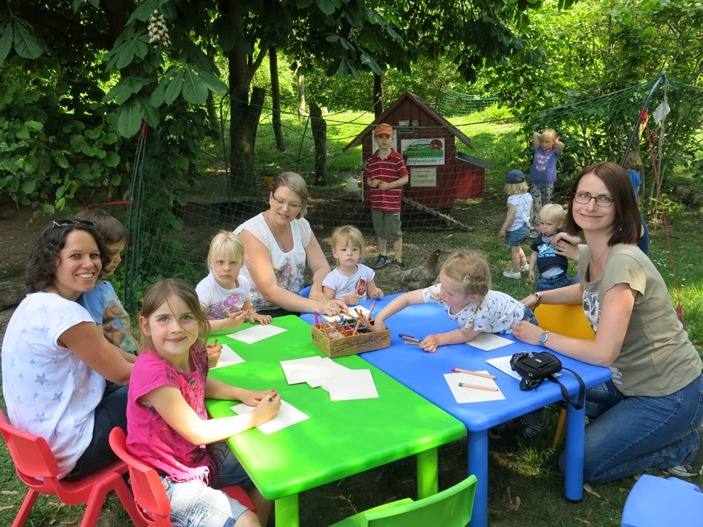 Gisela Steinhage bedankte sich bei einem Kaffeetrinken nach vier Wochen Hühnermobil in Retzen und Einweihung des Mobiliars für den Außenbereich bei den engagierten Eltern für die Bereicherungen.