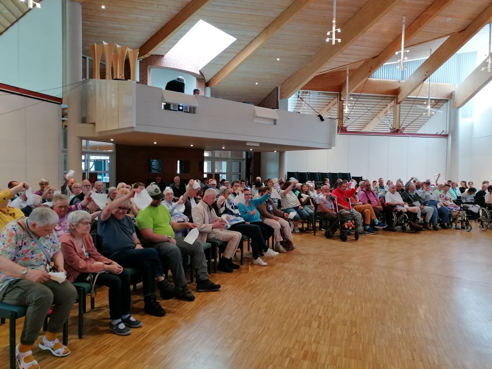 Unter diesem Motto fand das inklusive Gottesdienstformat aus Bethel am 1. Juni zum ersten Mal in Eben-Ezer statt. Mit ca. 140 Menschen wurde ein fröhlicher Gottesdienst gefeiert. Thema war: Wiedersehen macht Freude. Passend dazu wurde mit Taschentüchern gewinkt. Musikalisch begleitet wurde der Gottesdienst von der Eben-Ezer Band "bEEnd", die mit schwungvollen Songs begeisterte. Nach dem Gottesdienst gab es auf dem Kirchplatz Grillwürstchen und Eis. Dank fleißiger Helferinnen und Helfer hat alles wunderbar geklappt. „Wir freuen uns schon auf das nächste Jahr, wenn wir im März wieder mit Gästen aus Bethel ‚Gottesdienst einfach zusammen feiern‘“, so Pfarrerin Dörte Vollmer