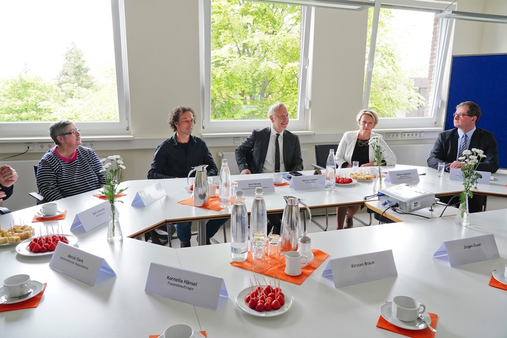 Am 17. Mai 2019 fand der Jahresempfang der Stiftung Eben-Ezer im Kirchlichen Zentrum Neu Eben-Ezer, Alter Rintelner Weg in 32657 Lemgo statt. Rund 200 regionale und überregionale Akteur*innen aus dem Bereich Kirche, Diakonie, Wirtschaft, Gesellschaft und Politik hatten sich angemeldet. Gastredner war Jürgen Dusel, Beauftragter der Bundesregierung für die Belange von Menschen mit Behinderungen. Jürgen Dusel hat das Amt des Bundesbehindertenbeauftragten seit einem Jahr inne. Bei der Feier zum 10-jährigen Jubiläum der UN-Behindertenrechtskonvention in Berlin vereinbarten Stiftungsvorstand Pastor Dr. Bartolt Haase und Jürgen Dusel einen Termin in Eben-Ezer: „Wir freuen uns sehr, dass Herr Dusel unsere Einladung annimmt und nicht nur Gast bei unserem Jahresempfang ist, sondern sich im Vorfeld auch die Zeit nimmt, mit Klient*innen und Mitarbeiter*innen ins Gespräch zu kommen“, betont Pastor Dr. Haase. Jürgen Dusel, der von Geburt an stark sehbehindert ist, traf sich bereits um 15 Uhr mit Klient*innen aus den Gremien Bewohnerbeirat, Werkstattrat und Frauenbeauftragte sowie leitenden Mitarbeiter*innen der Stiftung zu einem informellen Gespräch. Dabei ging es zum einen um die Auswirkungen der geplanten Erhöhung des Ausbildungsgeldes im Berufsbildungsbereich von Werkstätten mit Behinderungen. Konkret bedeutet das eine Verschiebung bei den Leistungsentgelten für Menschen mit Behinderungen, die zu Lasten der sogenannt leistungsstarken Beschäftigten mit Behinderungen geht. Ein Thema, das Werkstattrat und den Leiter von eeWerk Markus Toepffer stark beschäftigt. Zum anderen ist die medizinische Versorgung behinderter Menschen im ländlichen Raum ein großes Thema für die Stiftung. Für die Klient*innen sprachen Ingeburg Jahnke, Rolf Schmidt, Kornelia Hänsel und Marcel Dierk. Gemeinsam mit Madlen Engelhardt, Leitung der Region Lippe West und Sprecherin der Regionalleitungen des Geschäftsbereichs Wohnen, vermittelten sie Jürgen Dusel u.a. ihre Erfahrungen bei der hausärztlichen Versorgung durch niedergelassene Hausärzte. Mit in der Gesprächsrunde war auch Thorsten Löll, neuer leitender Arzt der Stiftung.