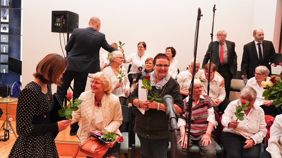 Beim auf das Gespräch und einen Pressetermin folgenden Jahresempfang stellte der Projektchor der Stiftung einen umfangreichen Teil des Programms. 35 Sänger*innen, die von einer Band live begleitet wurden, trugen Auszüge aus dem Musical Martin-Luther–King vor. Der Bürgermeister von Lemgo Dr. Reiner Austermann hielt ein Grußwort, in dem er betonte, wie gern er Gast der Stiftung sei. Der Theologische Vorstand Pastor Dr. Bartolt Haase gab einen Überblick auf Schlaglichter der Stiftungsentwicklung wie die aktuellen Bauprojekte, den Umzug der Verwaltung in ein ehemaliges Wohnheim, das umfangreich saniert wurde, und Änderungen auf der Leitungsebene. Auch auf das Thema „10 Jahre UN-Behindertenrechtskonvention“ und den starken Impuls, den die Konvention auch für die Entwicklungen in Eben-Ezer gibt, ging er ein. „Der Impuls der UN-Konvention hin zu einer inklusiven Gesellschaft ist unverkennbar. Er ist nachhaltig und kraftvoll“, stellte er fest – allerdings mit Einschränkungen: „Trotzdem gibt es natürlich auch die andere Seite: auch 10 Jahre nach Verabschiedung der UN-Konvention sind wir von der selbstverständlichen und vollen Teilhabe an vielen Stellen der Gesellschaft noch weit entfernt.“
