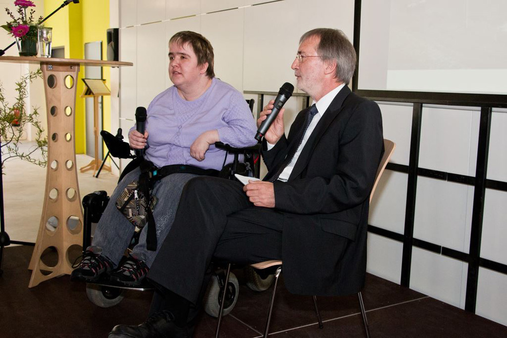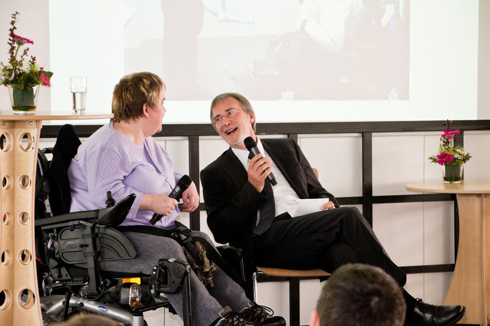 Mittlerweile ist sie auf ihren per Joystick lenkbaren Rollstuhl angewiesen. Zippel wies darauf hin, dass das Gebäude nicht nur für Menschen mit hohem Unterstützungsbedarf ausgelegt sei, sondern für alle Beschäftigten. „Auch das ist Inklusion“, so der Vorstand. André General, Leiter des Personalbereichs und Prokurist der Firma Essmann aus Bad Salzuflen, berichtete im Gespräch mit Artur Epp und Reiner Bernicke sowie Moderatorin Christine Förster über die guten Erfahrungen, die seine Firma mit zwei Beschäftigten von Eben-Ezer gemacht hat. Für acht Monate waren Artur Epp und Valentin Müller bei Essmann auf so genannten ausgelagerten Arbeitsplätzen tätig und digitalisierten Personalakten der Firma, die mit rund 1000 Mitarbeitenden europaweit tätig ist. „Es war für beide Seiten eine sehr bereichernde Zeit. Wir werden es auf jeden Fall wiederholen. Dieser Versuch hat sich wirklich gelohnt und hat sich zudem sehr positiv auf das Betriebsklima ausgewirkt, so André General beim Gespräch.