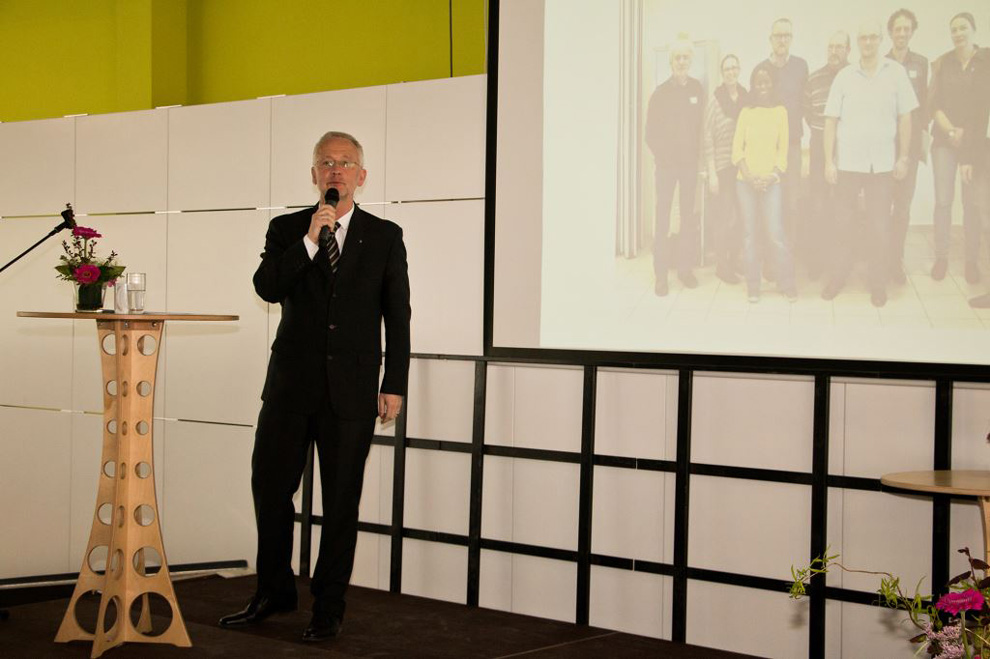 Passend zum Jahresempfang der Stiftung am 22. April konnte der Erweiterungsbau eröffnet werden. Der Projektverantwortliche und technische Leiter bei eeWerk Reiner Bernicke freut sich, dass die Stiftung mit dem Bau sowohl finanziell als auch terminlich eine Punktlandung hingelegt hat. Der Empfang fand nicht wie sonst im Kirchlichen Zentrum statt, sondern in der Montagehalle im neuen Gebäude.