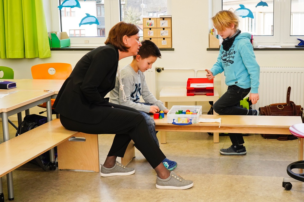 Yvonne Gebauer nahm sich gut 90 Minuten Zeit, um sich ein Bild vom erfolgreichen inklusiven Konzept der Grundschule der Stiftung zu machen, an der inzwischen 168 Schüler*innen lernen. 32 davon sind Kinder mit formal fest gestelltem sonderpädagogischem Förderbedarf. Die Ministerin kam mit den Grundschüler*innen ins Gespräch und ließ sich von ihnen erklären, wie sie einen Bauplan vom Arbeitsblatt in Gebäude aus Bausteinchen umsetzen.