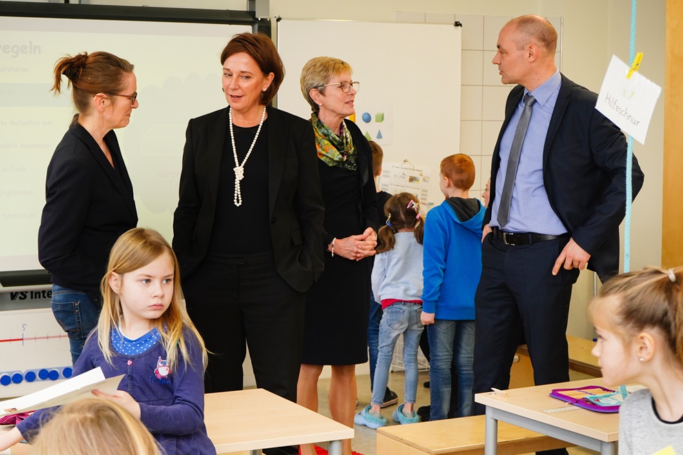 Am Donnerstag, den 14. Februar, besuchte NRW-Schulministerin Yvonne Gebauer die Ostschule der Stiftung Eben-Ezer in Lemgo. Die Ministerin kam auf Einladung der Stiftung. „Wir wollen der Ministerin einen lebendigen Eindruck davon vermitteln, unter welchen Bedingungen Inklusion gut gelingen kann“, so formulierte Schulleiterin Beate Busse die Motivation für die Einladung. Zusammen mit Pastor Dr. Bartolt Haase, Rita Berens, Landesregierungsschuldirektorin, sowie Marlies Böke, Schulamtsdirektorin des Kreises Lippe, hospitierte die Ministerin beim jahrgangsübergreifenden Unterricht der Klasse 1 und 2. Von 22 Kindern haben 5 Kinder hier sonderpädagogische Förderbedarfe. Lehrerin Saskia Flake erklärte im Anschluss, dass die konzentrierte, ruhige und zugewandte Unterrichtsatmosphäre das Ergebnis einer sechs bis zehnfachen Differenzierung z.B. im Fach Mathematik sei, damit jedes Kind in seinem Tempo und seinen Fähigkeiten entsprechend am Unterricht teilnehmen und davon profitieren kann. „Für die Kinder ist es normal, dass sie unterschiedliche Dinge und diese in unterschiedlichem Tempo lernen.“ „Wir richten den Unterricht an den Kindern aus und haben als Ergebnis kaum Konflikte unter den Kindern sondern erleben sie als sehr sozial und solidarisch miteinander“, ergänzte Schulleiterin Beate Busse.
