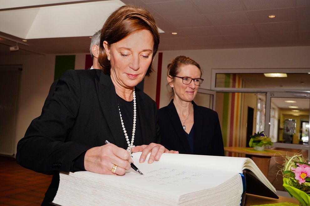 An der Gesprächsrunde im Anschluss an den Unterrichtsbesuch nahmen auch Dirk Tolkemitt, 1. Beigeordneter der Alten Hansestadt Lemgo, und Thomas Portong, Leiter des Geschäftsbereichs Jugend und Schule, sowie Walter Kern, ehemaliges Mitglied des Landtags NRW, und Vorsitzender des Vereins Freunde der Stiftung Eben-Ezer, teil. Ein Thema im Gespräch mit der Ministerin war die Ganztagsbetreuung. Hier gibt es Schwierigkeiten für Kinder mit Förderbedarf, an den Angeboten des offenen Ganztages gewinnbringend teilzunehmen. Dafür bräuchten die Kinder in den meisten Fällen ebenso wie im Unterricht Schulbegleiter*innen. Dieser Dienst endet aber nach Unterrichtsschluss um 13:05 Uhr. Für viele berufstätige Eltern ist das ein erhebliches Problem. Die Wünsche nach ausreichender Finanzierung inklusionsfördernder Bedingungen vermittelten Beate Busse, Pastor Dr. Bartolt Haase und Sabine Menzel, die den Bereich Kinder und Jugendliche Eben-Ezer leitet. Die Ministerin zeigte viel Verständnis für die Anliegen und formulierte ihre Anerkennung für die guten Bedingungen und Arbeit an der Schultwete in Lemgo: „Die Ostschule ist nicht nur ein Lern-, sondern auch ein Lebensort und macht vor, wie Inklusion gelingen kann. Die freundliche Lernatmosphäre trägt dazu bei, dass ein wahrer Teamgeist zu spüren ist im gemeinsamen Unterricht von Schülerinnen und Schülern mit und ohne sonderpädagogischen Förderbedarf. Inklusion ist ein Menschenrecht, dem sich die Landesregierung verschrieben hat. Bei der Umsetzung der Inklusion setzen wir auf Qualität und definieren dazu klare Qualitätsstandards, damit alle Kinder und Jugendlichen vom inklusiven Unterricht profitieren. „25 Kinder in einer Klasse mit drei Kindern mit sonderpädagogischem Förderbedarf mit einer halben zusätzlichen Stelle: Das beschrieb Yvonne Gebauer als Ziel für inklusive Klassen an weiterführenden Schulen und erläuterte, dass das Land 250 zusätzliche Studienplätze für Sonderpädagogik einrichte. Die Ministerin gab ein deutliches Bekenntnis zum Miteinander und Nebeneinander der verschiedenen Schulformen: „ Neben den inklusiv arbeiteten Regelschulen gehören für uns auch weiterhin die Förderschulen zu dem vielfältigen Angebot, aus dem Eltern den besten Ort für ihre Kinder wählen können.“ Nach dem angeregten fachlichen Austausch trug sich die Ministerin in der Aula der Ostschule in das Goldene Buch der Alten Hansestadt Lemgo ein.