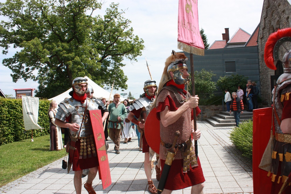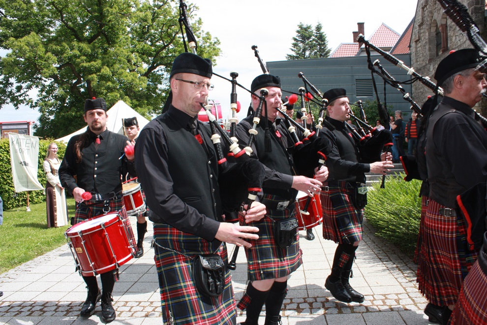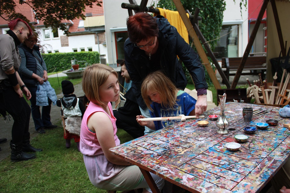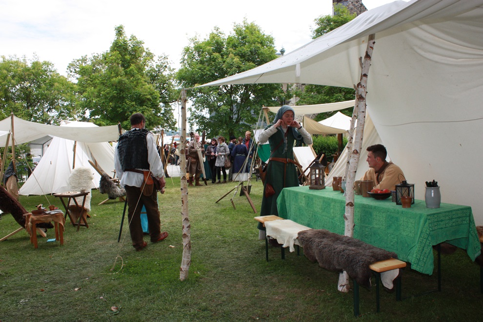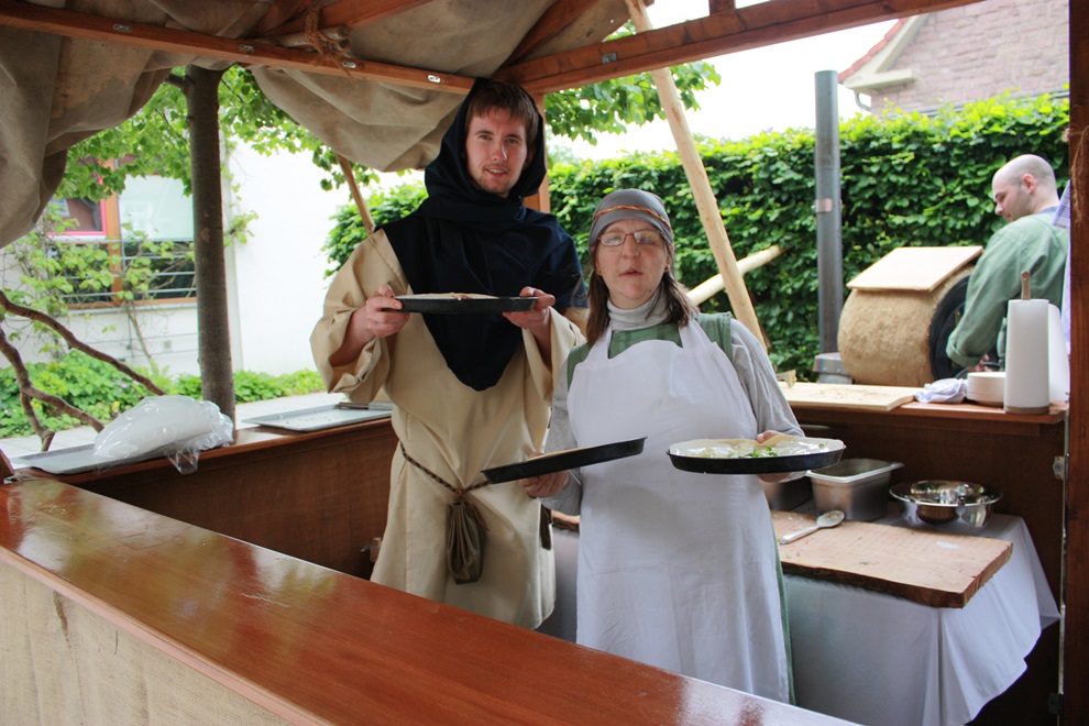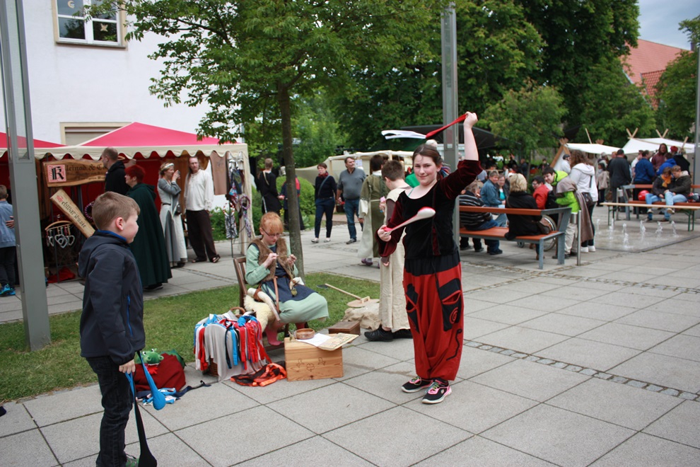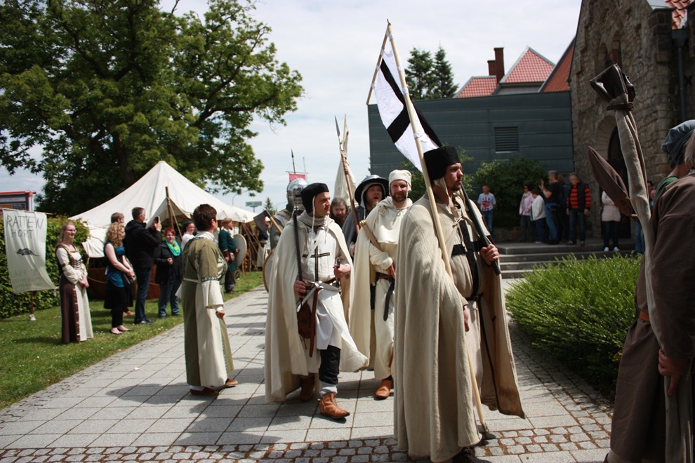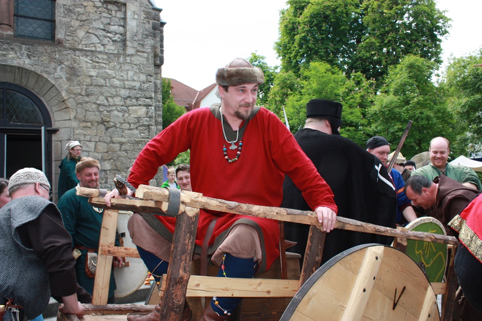 Am 30. und 31. Mai fand auf dem Gelände von Alt Eben-Ezer zum zweiten Mal ein großer Mittelaltermarkt statt. Nach dem Erfolg im letzten Jahr war das Eben-Ezers Beitrag zum 825-jährigen Stadtjubiläums von Lemgo. Am Samstag spielte leider der Wettergott nicht mit: trockene Phasen wurden immer wieder durch sintflutartige Regengüsse unterbrochen. "Alles war klamm und kalt", so eine Standbetreiberin, die wie viele andere auch in einem Zelten der Lagerstadt übernachtet hatte. Am Sonntag allerdings, bei stabiler Wetterlage, stürmten die Besucher das Gelände regelrecht. Und ihnen wurde viel geboten: viele Stände mit Kunsthandwerk, verschiedene kulinarische Verlockungen, der Umzug des Marktvolkes, Schwertkämpfe und die Verfolgung eines Diebes mit anschließender Prangerstellung.