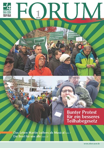 Das FORUM Nummer eins im Jahr 2017 enthält wieder viele interessante, kurze Einblicke in den Alltag der Stiftung. Diesmal auch eine ausführliche Reportage zum Bundesteilhabegesetz. Eine große Fraktion von Beschäftigten und Mitarbeitern von eeWerk hat der wichtigen Kundgebung im November in Berlin teilgenommen. Nach den Protesten wurden entscheidende Änderungen am geplanten Gesetz vorgenommen. Teilhabe wirkt!