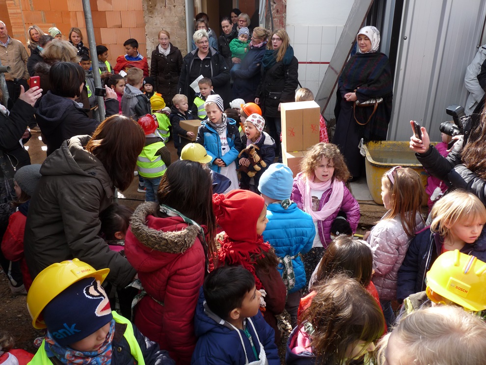 Kinder, Eltern, Erzieherinnen und Gäste konnten am Donnerstagnachmittag (28. April) zur Freude von Kita-Leiterin Angelika Fabri bei blauem Himmel, Sonnenschein und nicht allzu kalten Temperaturen Richtfest feiern: das Ev. Familienzentrum Am Weidenbusch 9 in Trägerschaft der Stiftung Eben-Ezer erhält einen Neubau, der im Oktober bezugsfertig sein soll.