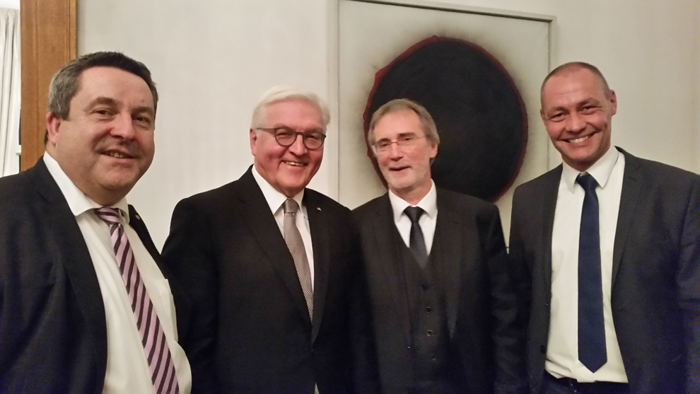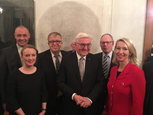Der Vorstand der Stiftung war mit von der Partie, als am Freitag vor dem ersten Advent die lippische Delegation ins Schloss Bellevue reiste. Die Tanne aus Brakelsiek leuchtet nun vor dem Sitz des Präsidenten. Frank Walter Steinmeier kennt Eben-Ezer schon aus seiner Zeit als Kanzleramtsminister bei Gerhard Schröder. 2004 war Eben-Ezer das erste Mal mit der sogenannten Kanzlertanne nach Berlin gereist. Die Tradition wurde dann im Außenministerium und nun im Schloss Bellevue fortgesetzt. Gemeinsam mit Wolfgang Stückemann, ehemaliger Aufsichtsratsvorsitzender von Eben-Ezer und Initiator der immergrünen Aktion, trafen Pastor Dr. Bartolt Haase und Udo Zippel einen entspannten Präsidenten, der sich über den Besuch aus seiner lippischen Heimat sichtlich freute.