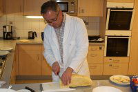 Andreas Strothmann schneidet Brot aufDer gelernte Ökotrophologe hat 9 Jahre den hauswirtschaftlichen und technischen Bereich einer Altenhilfeeinrichtung geleitet und war dort für siebzig Mitarbeiter verantwortlich. Seit einem guten halben Jahr arbeitet er jetzt in Eben-Ezer.