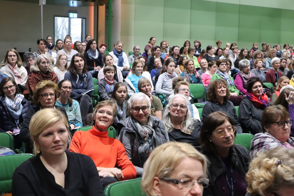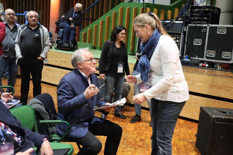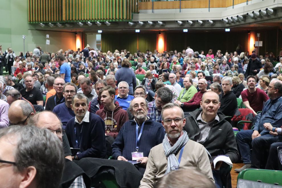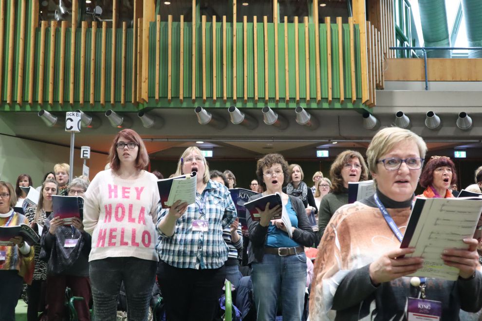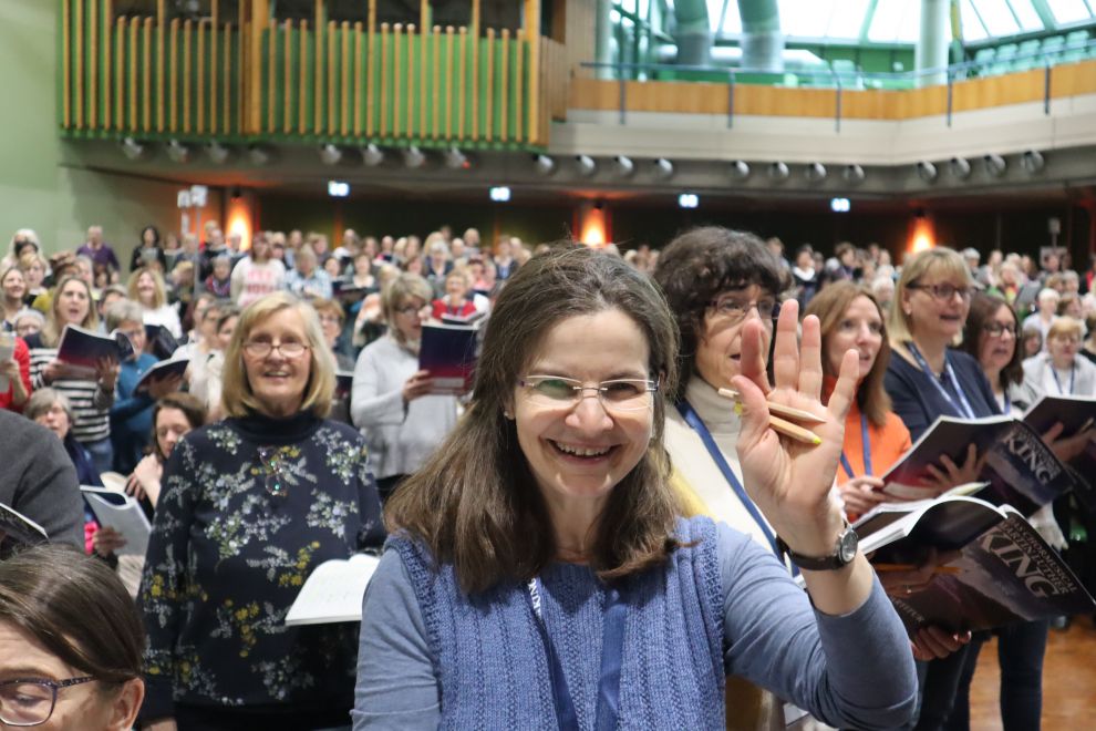 Zwei Wochen vor der Premiere trafen sich die verschiedenen Chöre mit ihren Proben-Ergebnissen im grünen Saal der Hagener Stadthalle. Von 12:00 bis nach 18:00 Uhr wurde mit wachsender Begeisterung geprobt. Nach drei Stunden Probe kamen nach der Pause die Solist*innen, die Komponisten HaJo Gäbler, Christoph Terbuyken und der Autor und Librettist Andreas Malessa auf die Bühne. Sie stärkten die Chorsänger*innen mit ihrem Lob und dankten allen, die mitmachen. Choreographische Ansagen folgten, denn der Chor soll nicht nur singen, sondern auch mit Bewegungen beeindrucken: Welle, Tanzen, Schunkeln, Klatschen. Das wird bei der Aufführung umso mehr wirken, wenn dann an jedem Arm ein Bändchen von einem Lichtdesigner für Farbeffekte angesteuert wird.
