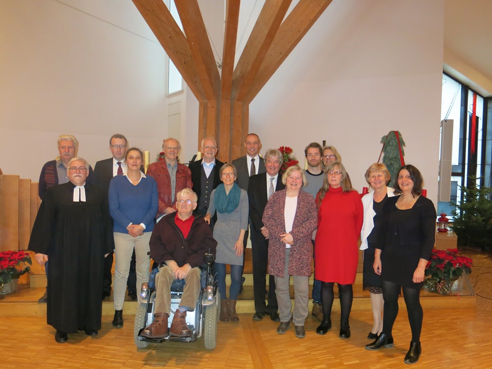 Foto: Abschied inmitten des Teams von Kirchengemeinde, Gemeindebeirat, Gästen und Familie: Raimond Urhahn ( 7.v r. mit Ehefrau Gabriele und Sohn Lars) geht nach 26 Dienst als Gemeindepädagoge der Kirchengemeinde Neu Eben-Ezer in den Ruhestand