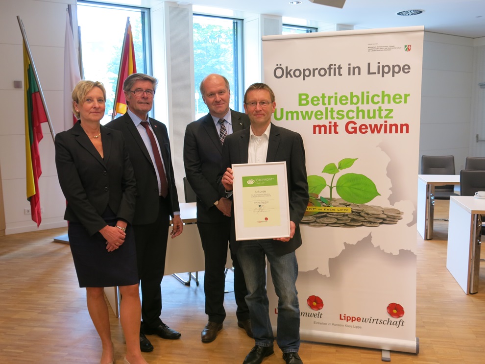 Gemeinsam mit 11 Unternehmen aus der Wirtschaft, dem sozialen Bereich und dem Kreis Lippe hat die Stiftung Eben-Ezer an dem Projekt Ökoprofit teilgenommen. Ökoprofit ist ein durch das NRW-Umweltministerium gefördertes Projekt, das vor allem kleinere und mittlere Unternehmen unterstützen soll, weniger Ressourcen zu verbrauchen und Betriebskosten zu senken. Christopher Heine, Leiter der Servicebetriebe der Stiftung, und Jörg Kopsieker, Leiter des technischen Bereichs der Stiftung, hatten sich mehr als ein Jahr an den Workshops beteiligt. Diese fanden in den einzelnen Unternehmen statt, die Auftaktveranstaltung am 19. März 2014 bei Eben-Ezer im Kirchlichen Zentrum. In den Workshops ging es um umweltrelevante Themen wie Stromverbrauch, Wärmebedarf, Druckluft und Beleuchtung, aber auch Arbeitssicherheit und Mitarbeitermotivation. Am Ende der einjährigen Projektphase wurden Eben-Ezer und die anderen Betriebe, darunter das Feierabendhaus der AWO in Bad Salzuflen, die Firma Brandt Kantentechnik GmbH aus Lemgo und die Schomburg GmbH&Co.KG aus Detmold auf die Erfüllung der relevanten Kriterien geprüft. Die Prüfungskommission bestand aus Vertretern der Kooperationspartner(Kreis Lippe, Baum-Consult, efa-Ennergieeffizienzagentur, Energieagentur nrw, Com-Consult, IHK, Kreishandwerkerschaft PB-Lippe).