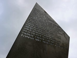 Die äußere Form des Mahnmals erinnert an eine Scherbe, einen Splitter oder Stachel. Nicht im Lot, sondern geneigt steht es im Boden; nicht rund und gefällig, sondern mit Ecken und Kanten; nicht sorgfältig ausgerichtet, sondern wie zufällig hingeworfen. So erinnert dieses Zeichen an die Menschen, die ihrer Zukunft beraubt wurden: Sie wurden getötet, weil sie nicht normgerecht waren, weil sie aus dem Rahmen fielen, weil man sie für unvollkommen und fehlerhaft hielt.