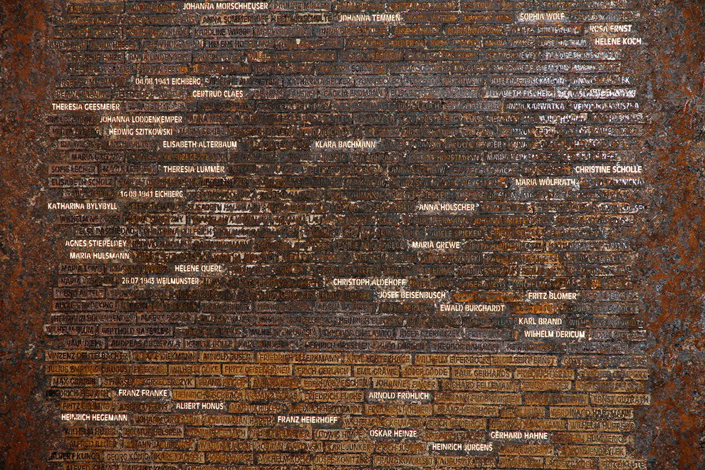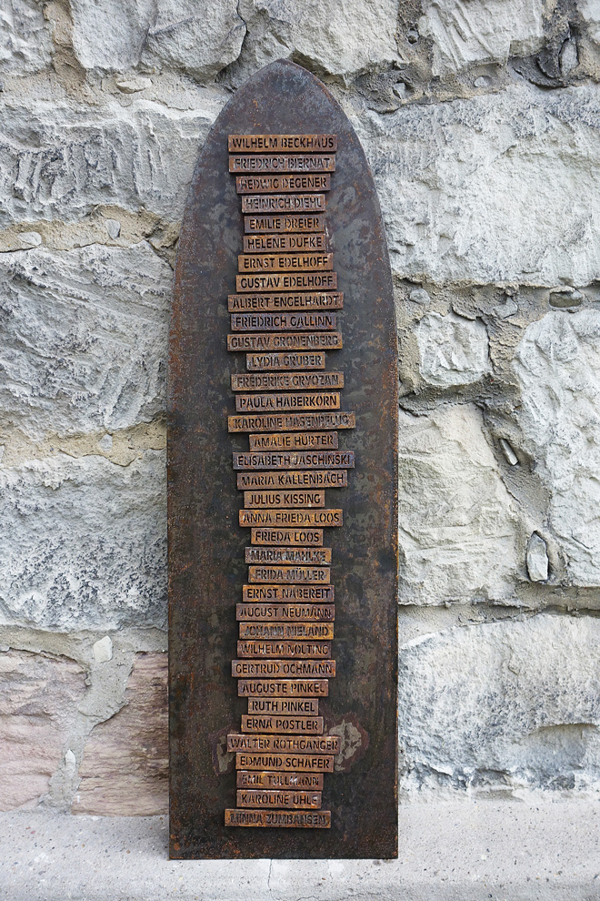 Die genormte Schrift stellt einen optischen Bezug zur schablonierten Beschriftung der Eisenbahnwaggons her, mit denen die Menschen von Warstein aus in den Tod geschickt wurden. Die Namen wurden durch einen Laser aus dem Stahl herausgebrannt, auch dies soll als Sinnbild für Feuer, Auslöschung und Zerstörung verstanden werden. Einige von Ihnen haben vielleicht noch die von höchster Todesangst erfüllten Worte eines Bewohners im Ohr, die bei der Fachtagung am vergangenen Freitag zitiert wurden: „Die wollen uns kaputtmachen!“.
